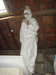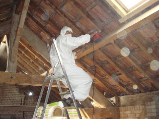 Le port du masque de protection n'est pas du luxe au vu de toute la saleté que nous pouvons remuer en enlevant les tuiles.