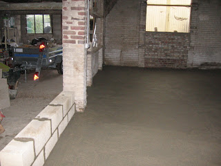 La dalle de béton est coulée, 2 rangs de parpaings sont montés là où il y avait la grande porte et toutes les fenêtres en bois (pourri) sont démontées.
