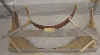 D'en bas on ne voit pas la légère déformation de la marche supérieure, ce sera corrigée lors du coulage du béton, le sable permet de faire une contre force pour éviter que les 2 quarts de cercles qui forme la marche du bas se déforme.